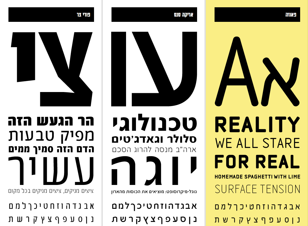 אותיות בסלון הן כבר לא שריטה פרטית של מעצבים; בשנים האחרונות רואה אור מבחר חסר תקדים של טיפוסי אות עברית, בזכות הטכנולוגיה הדיגיטלית שמקלה על עיצובם והפצם. הפונטים החדשים אינם רק מרכיב בארגז כלים מקצועי שמיועד לגרפיקאים, אלא חלק מ״סצנה״ מתעוררת: בתי ספר לעיצוב מציעים סדנאות לטרינג, אירועים טיפוגרפיים מושכים מאות משתתפים, תערוכות מוזיאליות מציגות תהליכי עבודה על טיפוסי אות, ולכי תמצאי פונט אחד שיכנס לך למחשב לפני שעבר ״אירוע השקה״ מיוחצן. צורתה של האות העברית כבר אינה רק נחלת אנשי מקצוע ויודעי דבר – נדמה שהיא פופולרית יותר מאי פעם.