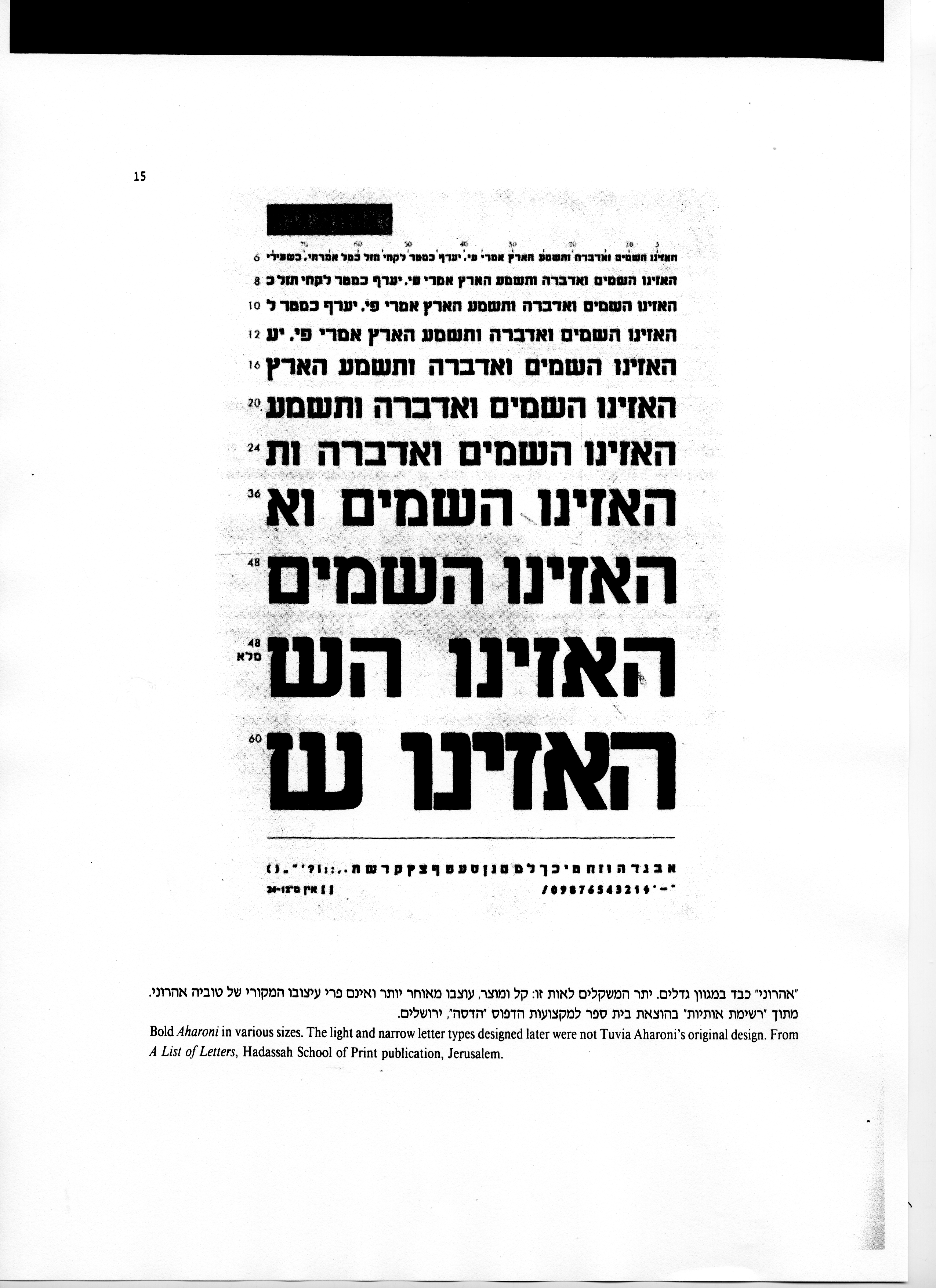 אות הדסה "Hadasa molcho catalog 1". ברישיון סריקה דרך ויקיפדיה.נרקיס בלוק – נעימה לעין ועשירת צורות. אף מילה על השקותאות אורון. מקור: “אות היא לעולם” — קובץ מאמרים מוקדש לעיצוב האות העברית. הוצאת משרד החינוך, תש״ן.