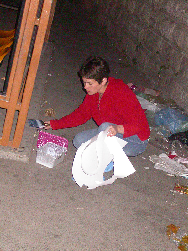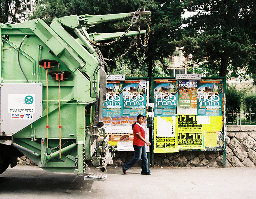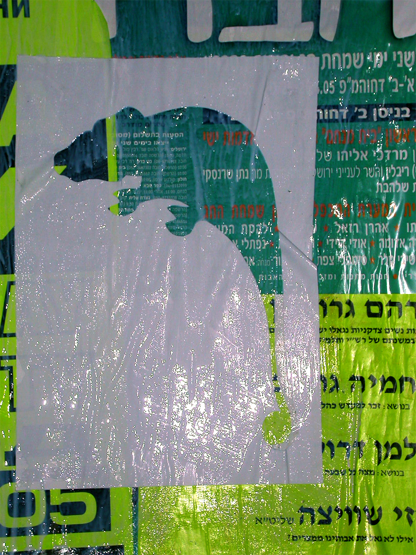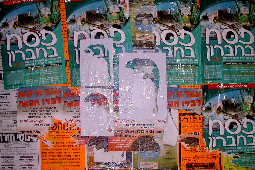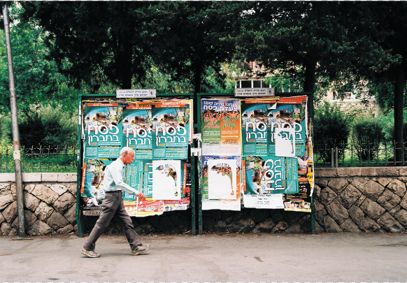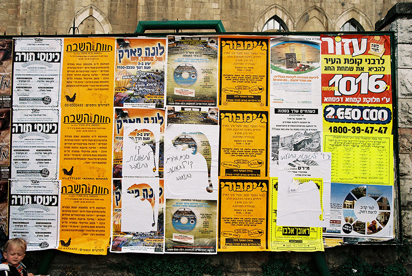 במוסררה ילדה אחת עומדת ומסתכלת כל זמן שאני מדביקה, וגם אחר כך. אני מנסה לדבר איתה, אך כל פניותי נענות במשיכות כתפיים בישניות. אני שואלת אם היא מנחשת מה יקרה כאן בסוף. משיכת כתפיים. ״בואי ותראי, זאת הפתעה״. אני יושבת במרחק מה מהלוח לצלם. חרדי אחד שנכנס לחצר עם השקיות לשבת אומר לי שאני לא יכולה לשבת שם, כי זו שכונה חרדית ואסור שיראו אותי ככה. ״אני מצלמת את הלוח אדוני, לא את האנשים״. הוא אומר לי להזדרז.
