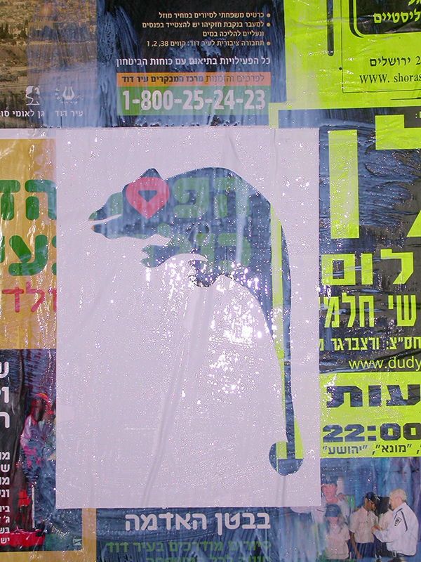 רתם, עפר ואני עומדים ליד שורת הפקעות שהדבקנו ב״כיכר השבת״. עפר מחזיק את הדבק, רתם את הכרזות. נשאר לי רק לצלם. לידינו עוצר אוטו אפור של פיקוח עירוני.