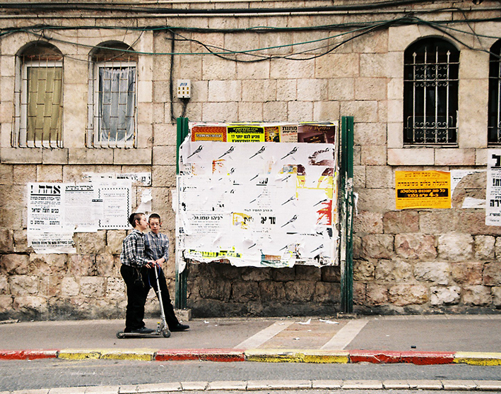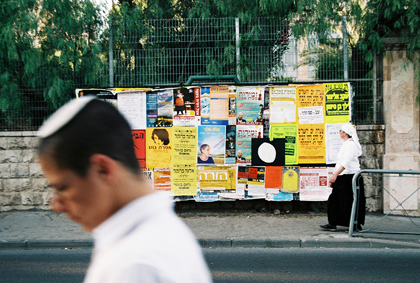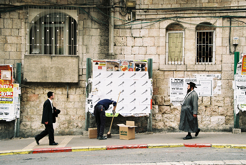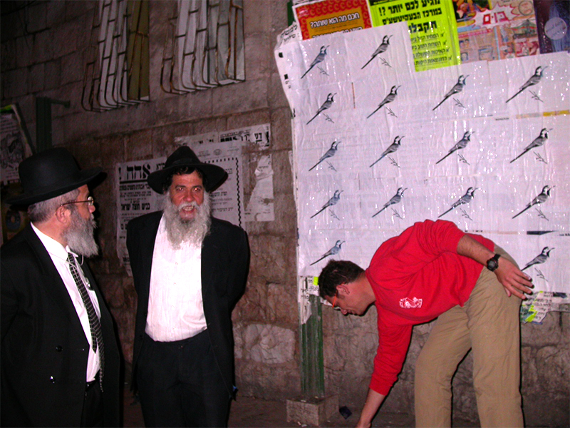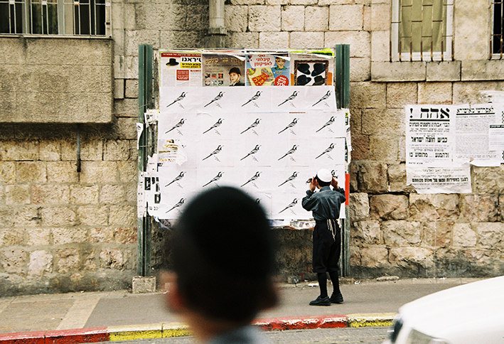 – ״פשוט יש פה משהו ממש מוזר״, הוא לא מחכה לתשובה. ״כל יום איזה מישהו פה תולה מודעה נורא משונה, אז אני מקלף אותה״. אני פוערת עיניים, לא אומרת כלום. המקלף הסדרתי הוא מאבטח בית ספר בשנות הארבעים, לבוש במדי חברת השמירה, מרכיב משקפיים, חובש כיפה סרוגה. ״אולי את יודעת מי תולה את זה?״