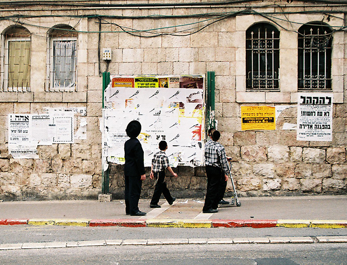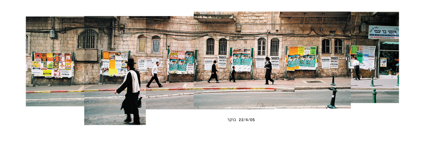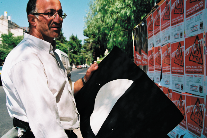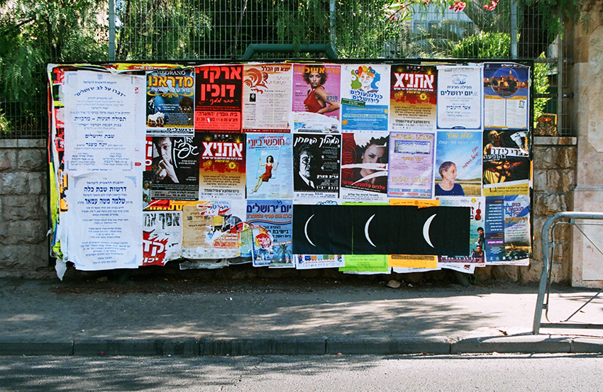 מרחוק אני רואה שמישהו כבש את הלוח. מודעות אדומות מכסות את כולו. אין סנטימטר חשוף. כרזות שקוראות לסרב פקודה, לא לגרש יהודים מבתיהם. אני נעמדת על המדרכה החלקה מדבק, פורשת את הירח. לתפאורה דרמטית כזאת הוא טרם זכה. הירח תופס את מקומו על גבי משפחת מתנחלים לחה, חוגגת את נצחונו הצנוע על הגוליית האדום שמתחתיו. אני חושבת על מפגש ההדבקות הזה, בין ההדבקה החד-פעמית, האדומה, המוחלטת, המפורשת והמשתלטת, לבין ההדבקה המתמשכת, הקטנה – יחסית, שזזה, בשחור-לבן, בלי מילים, בלי מסר חד משמעי. האם הירח יתפס כאיום גם על גבי תפאורה כזאת?