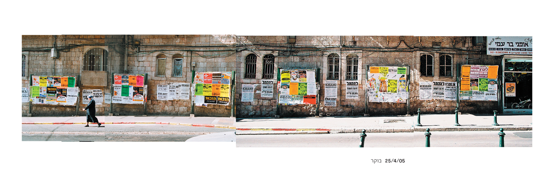 מהלך ההדבקה: בפינתו הימנית העליונה של לוח מודעות ברחוב רחל אימנו הודבקה בליל א׳ אייר כרזה שחורה.