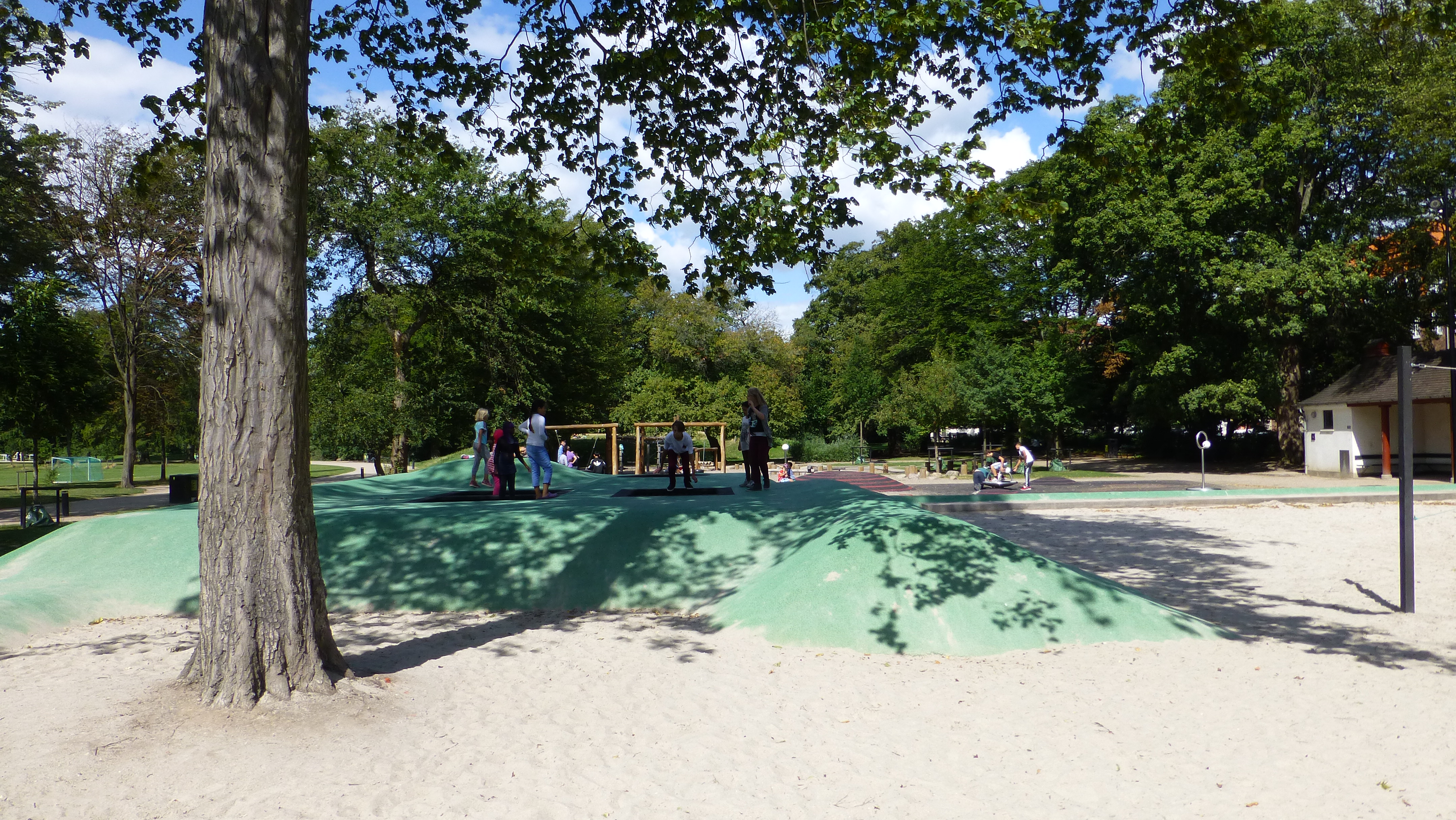הטרמפולינות השקועות בגבעה הירוקה מספקות למנתרים יתרון מובנה. גם לדרדקים בני שנתיים שאינם מעזים להתיק את כפות הרגליים מהמשטח הגמיש, הלוקיישן מבטיח להרגיש על-הגובה. הרשת השחורה מקפיצה בנדיבות, ומעניקה לגוף הנוחת תחושת-נגד מקרקעת. הטרמפולינות פזורות ברצף המייצר מפגש חברתי בין ילדים שוחרי קפיצות ושוויץ, אשר מביטים על הפארק מלמעלה וזה על זה בגובה העיניים כמו להקת צפרדעים בשלולית.